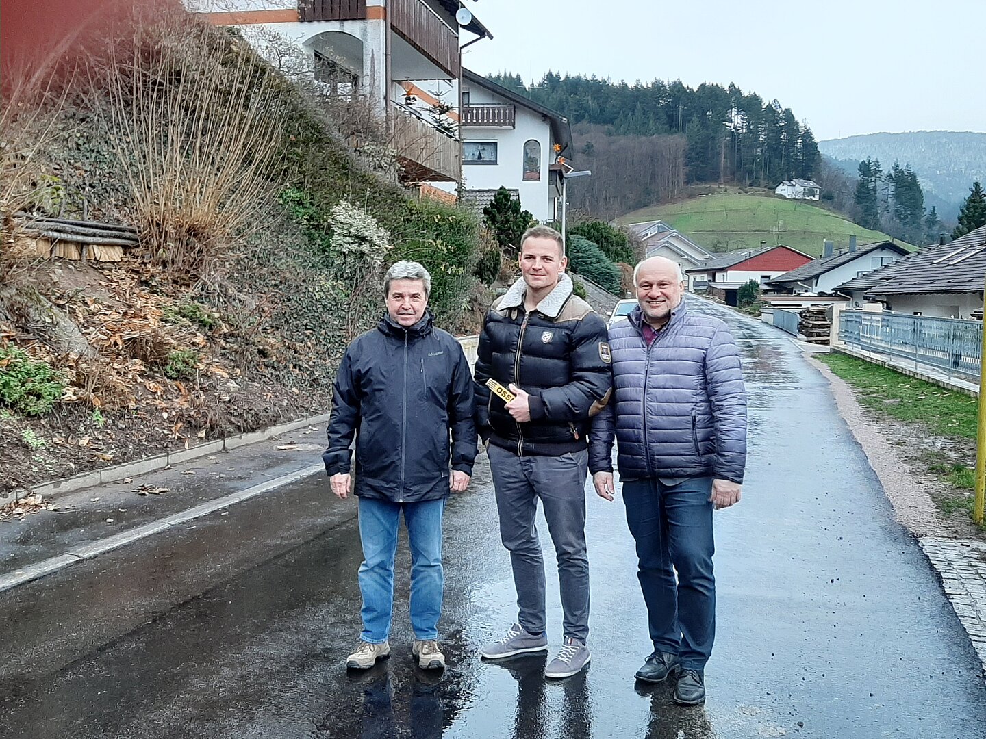 In Seebach wurden drei Straßensanierungsarbeiten noch vor dem Wintereinbruch fertigstellt. Die Wildenbergstraße, die Zufahrt zum Gewerbegebiet und die Geisdörflestraße sind für den Verkehr freigegeben. Auf dem Bild, von links: Paul Huber (Ortsbaumeister Gemeinde Kappelrodeck, Projektleitung), Ewald Buk (Bauleiter Asphaltierung OSSOLA GmbH), Reinhard Schmälze (Bürgermeister Gemeinde Seebach)