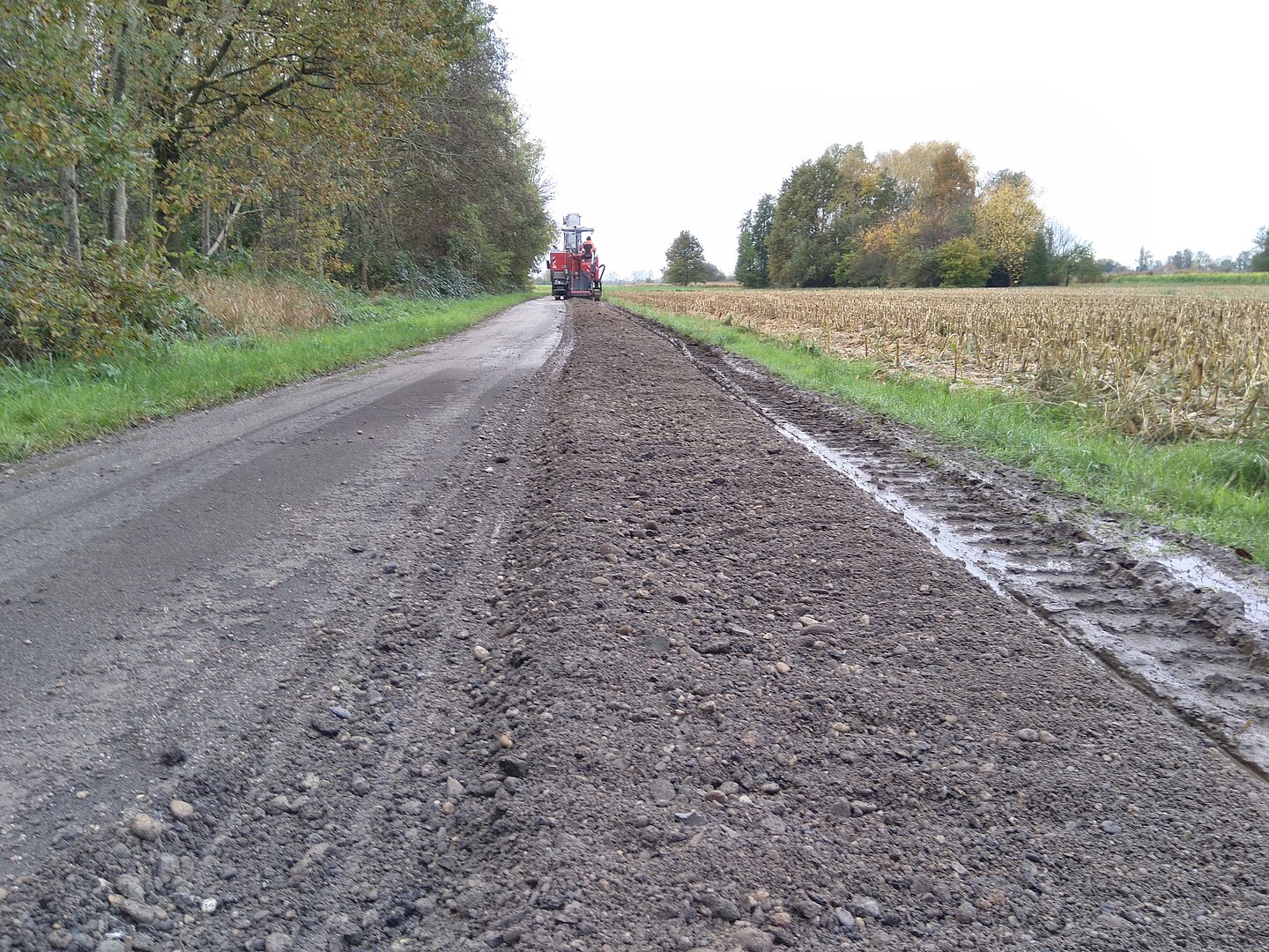 Geschädigte Wirtschaftswege werden gefräst. Das Fräsgut vor Ort einplaniert und mit neuer Trag- und Deckschicht ein langlebiger Aufbau hergestellt.